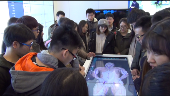 首先,天堰公司技术总监周靖杰带领同学们参观公司医教产品,介绍了急救训练模型人、综合超声虚拟训练系统、介入手术虚拟训练系统等产品用途与开发流程。