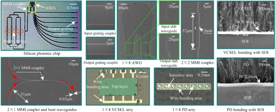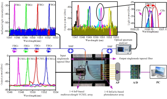 硅基光子学的发展为光学系统的小型化提供了可能,李鸿强教授课题组通过“光纤光栅光子学”与“半导体光电子学”之间的交叉融合,首次开展了光纤光栅解调光路硅基光子混合集成的研究。将III-V族垂直腔面发射激光器、多模干涉耦合器、光栅耦合器、阵列波导光栅和III-V族光电探测器等各功能单元器件进行异构集成,利用光束传播法和时域有限差分法进行各功能单元器件的理论建模和光学特性仿真优化,基于顶层硅厚度为220nm、掩埋层二氧化硅厚度为2μm的SOI晶圆,完成了输入/输出光栅耦合器阵列、多模干涉耦合器、阵列波导光栅的SOI光子集成芯片流片,利用苯并环丁烯作为键合介质进行了III-V族片上光源和光电探测器的混合集成。